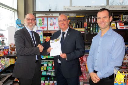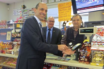En présence de M. Yves Servais, directeur général de l'AMDEQ, et de M. Serge Léveillé, propriétaire du Dépanneur Pétro-Canada à Saint-Henri-de-Lévis, M. Blaney a promis de livrer une bataille au cours des prochains mois afin de faire réduire les frais d'utilisation, si possible à 1 %.